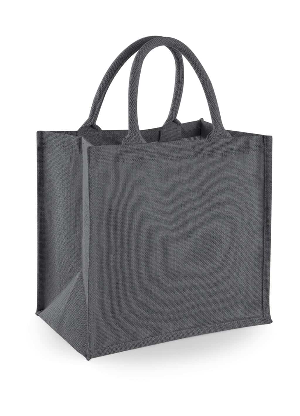100% Jute, laminated Cotton webbing carry handles (length: 40 cm) Capacity: 14 Litres Dimensions: 30 x 30 x 19 cm Maximum print area: 23 x 22 cm.