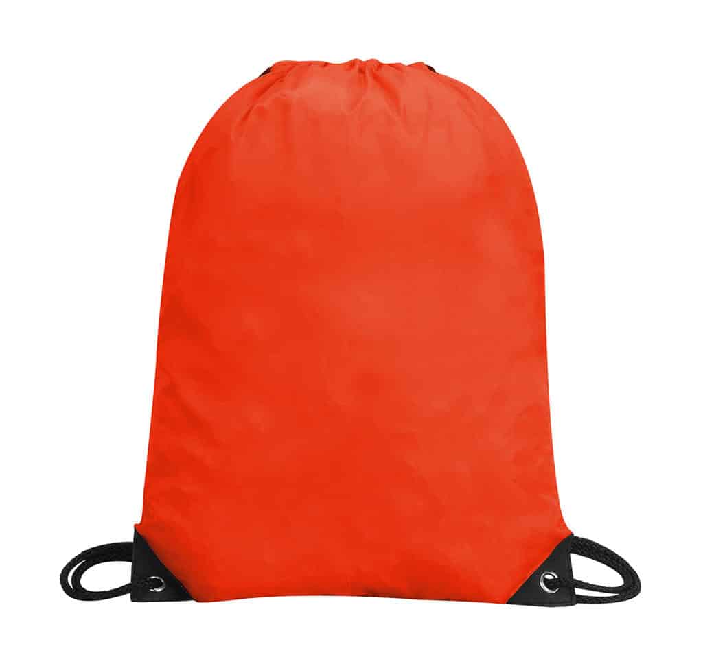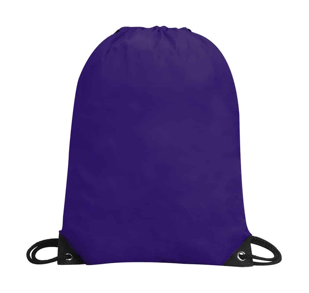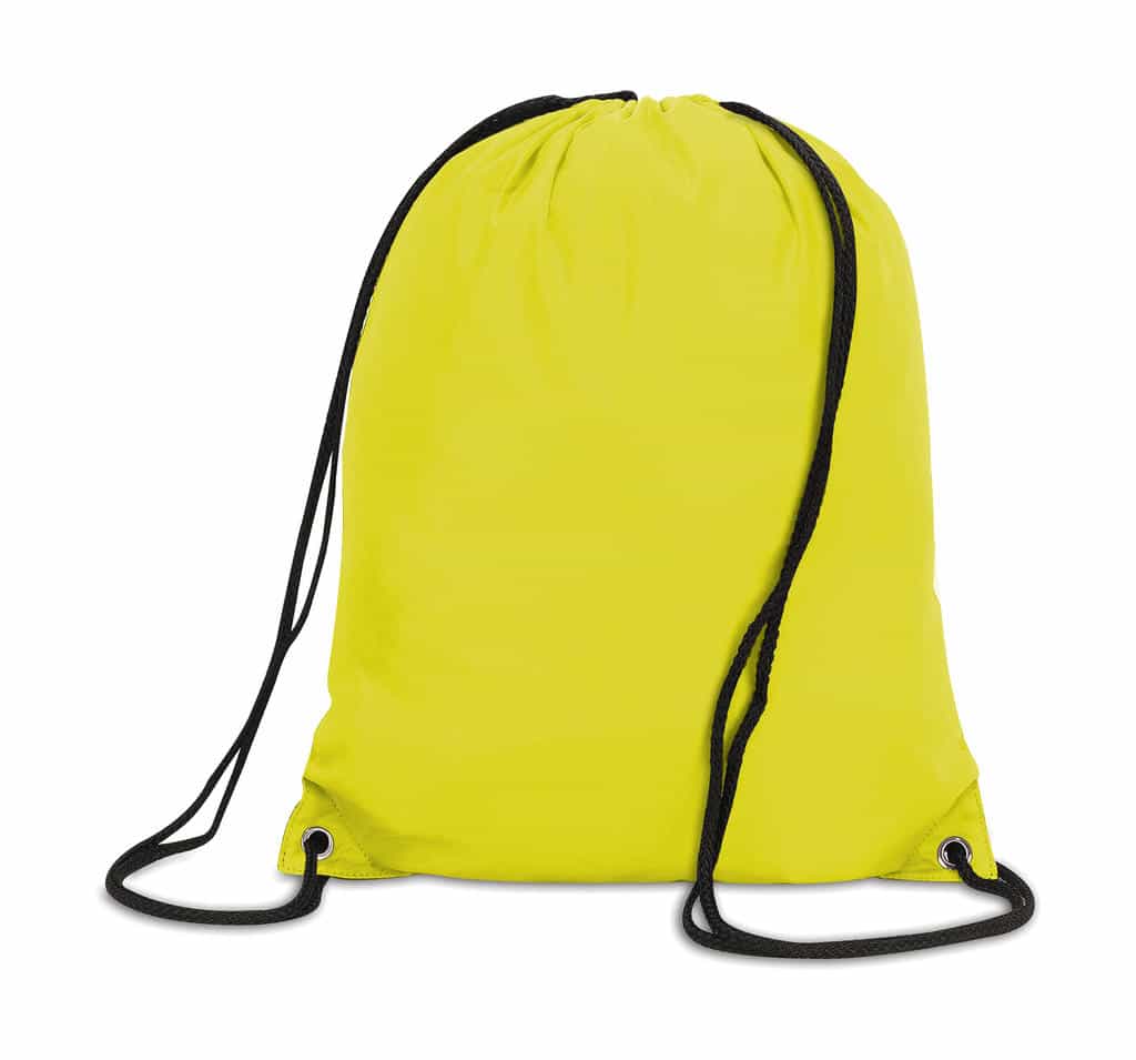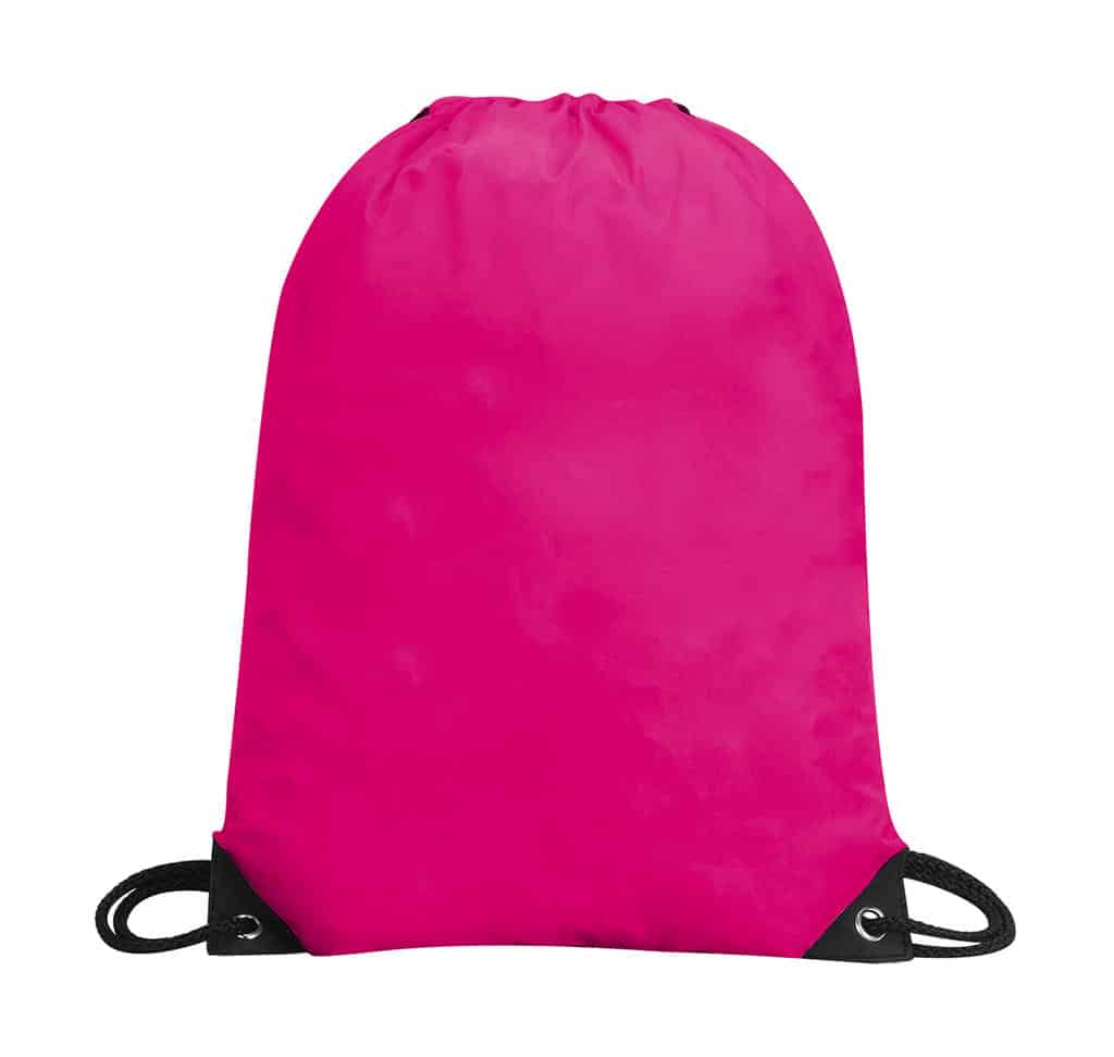 100% Polyester (210D) with PU backing Classic drawstring backpack Strong polyester cord carrying handles Reinforced corners (black on back) with metal eyelets Water-resistant Suitable for printing on either side Capacity: 13 Litres Dimensions: 34