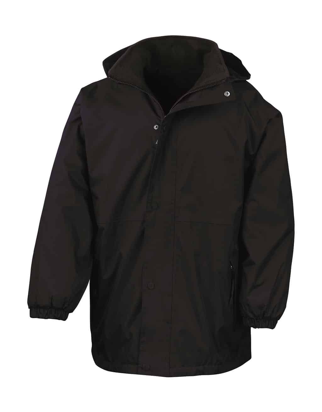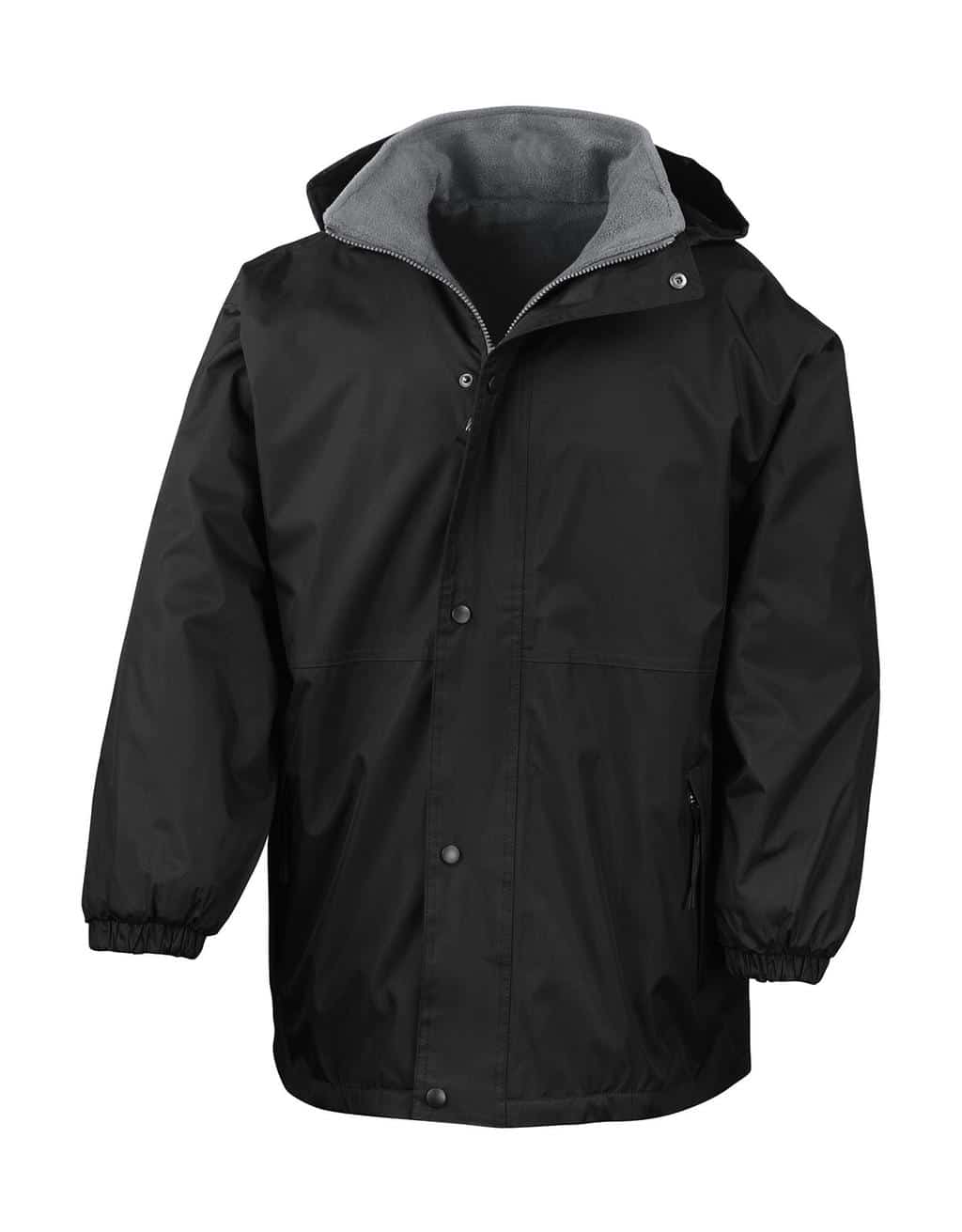 Outer: 280 g/m², 100% Polyester Reverse (partly in contrast color): 280 g/m², 100% Polyester (Active Fleece by Result®, Anti-Pilling) Double stitched taped seams Wind and waterproof (4,000 mm) Concealed hood in collar with tear release Safety hang