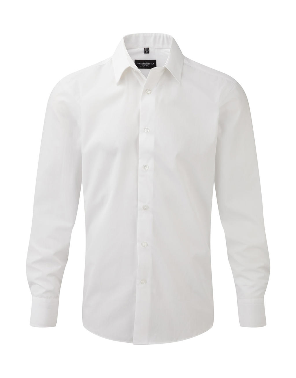 115 g/m² (White: 110 g/m²) 65% Polyester, 35% Cotton (poplin) Long sleeve Stiffened, semi-cutaway boned collar Stylish yoke design Tonal buttons Stylish, rounded edge 2 button adjustable cuff (with option for cuff links) Tailored fit Rounded hem