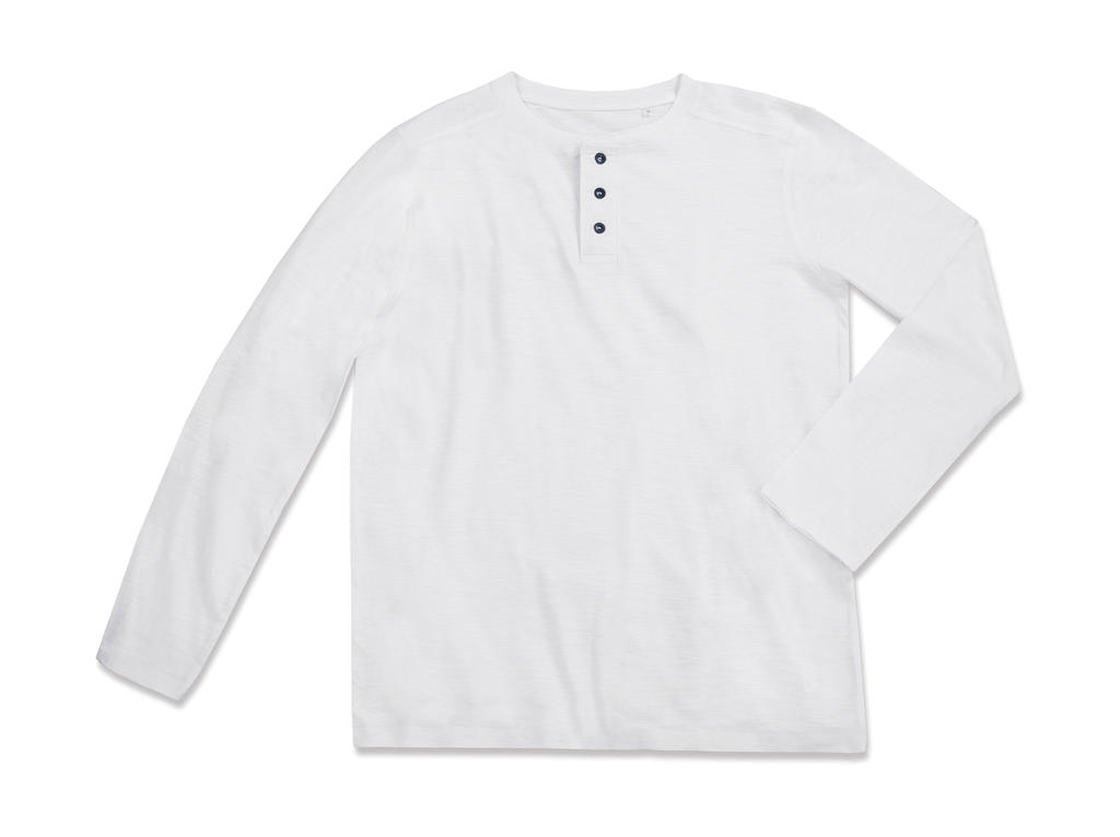 140 g/m² 100% Cotton, ring-spun (slub), Single Jersey Rib collar Neck tape Wide placket with 3 metal buttons (nickelfree) Front yoke Zigzag stitching on seams Side seams.