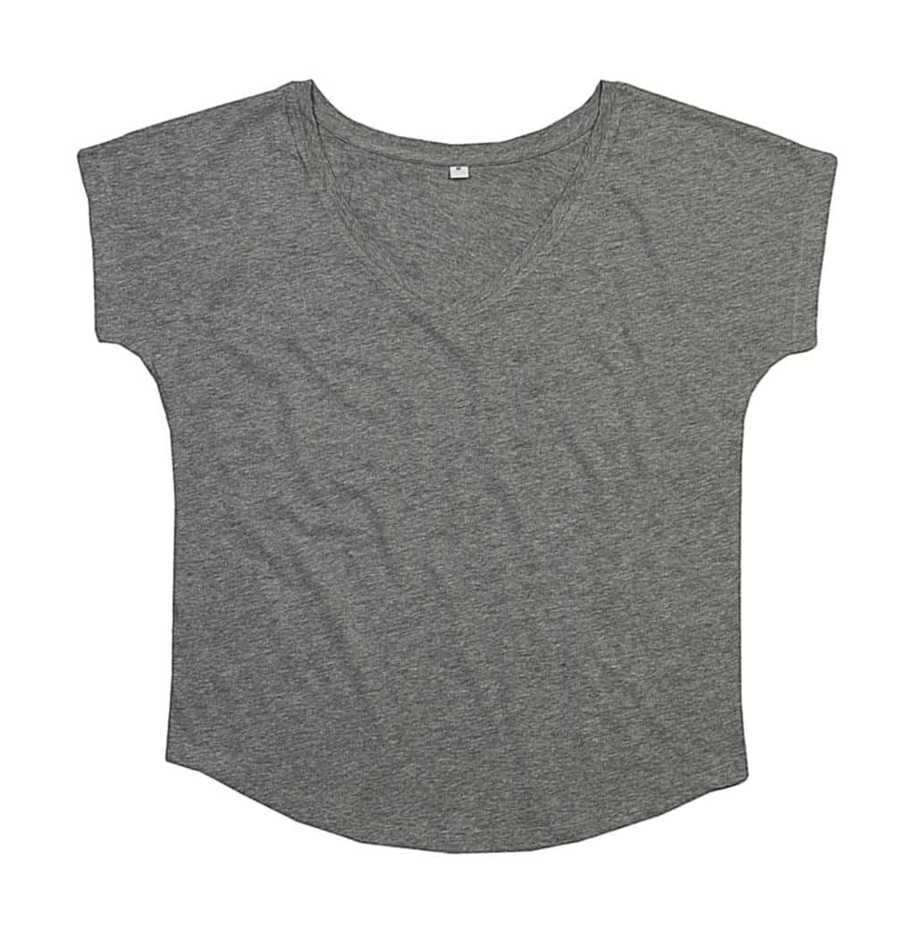 125 g/m² 100% Cotton (Organic), ring-spun and combed Heather Grey Melange: 85% Cotton,15% Viscose Single Jersey Deep V-neck Narrow rib neckline Curved hem Tear-off label at back neck Loose fit.